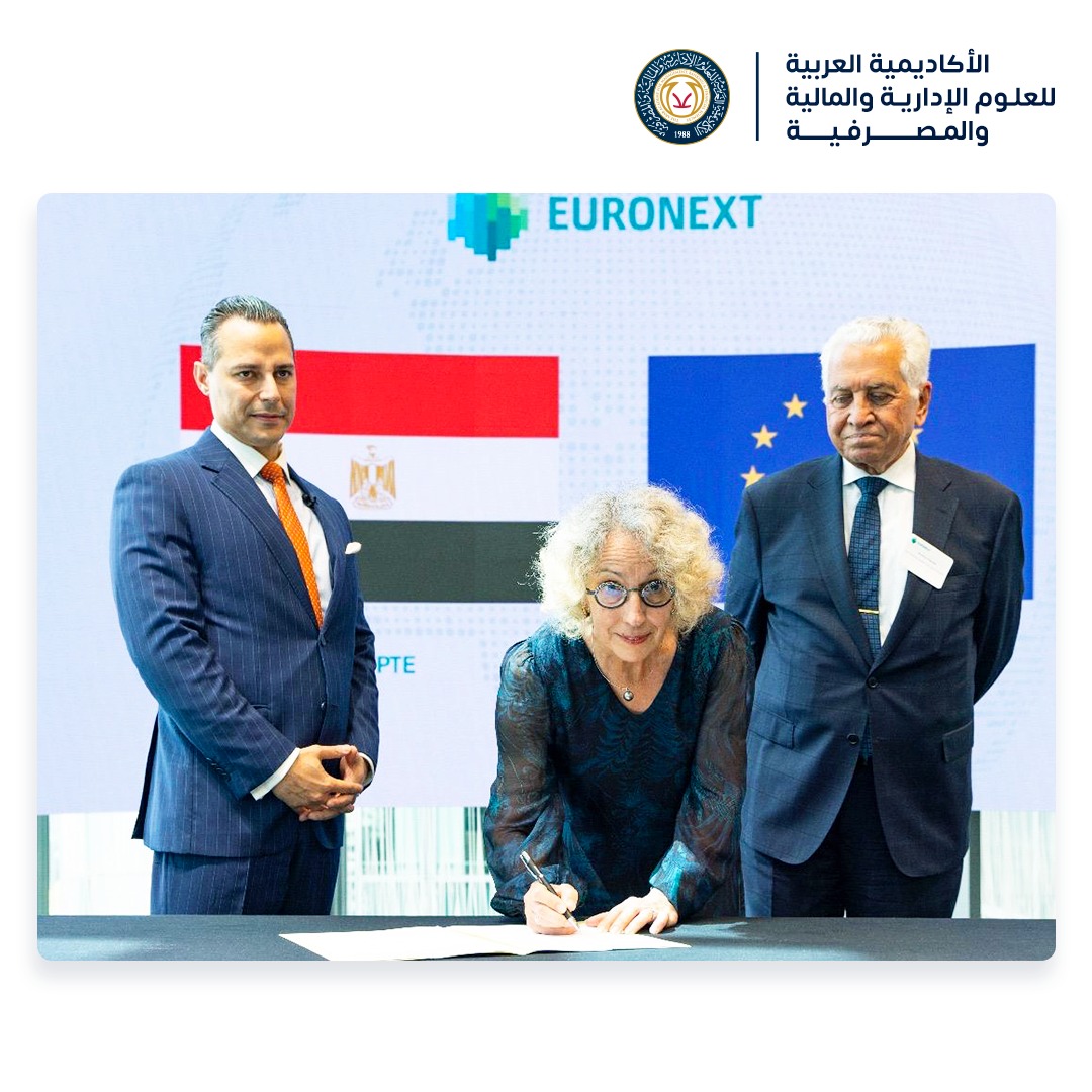 In the French capital, Paris, and at the Euronext European Stock Exchange headquarters located within the Paris Stock Exchange, a cooperation agreement was signed between the Arab Academy for Management, Banking and Financial Sciences, represented by Dr. Mostafa Hodeib, President of the Academy, and Ms. Véronique de la Bachelerie, President of the International Group for Sustainable Finance (IGSF) and former CEO of Société Générale Bank, as well as Mr. Souhail Eskandar, President of the COFICERT Group.
